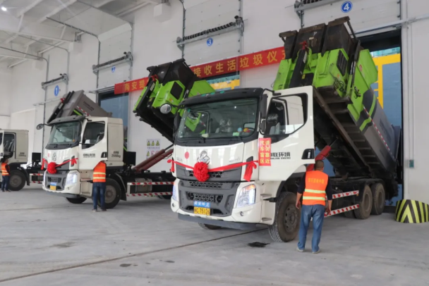 15时30分三辆垃圾运输车依次缓缓驶入垃圾接收大厅。