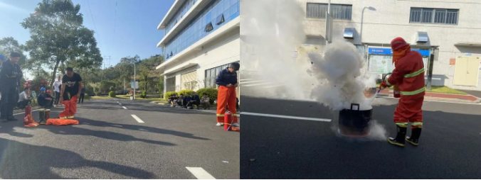 演练模拟厂区某处发生火情后,公共广播系统发出消防警报,员工听到警报声,用湿毛巾或手捂住口鼻,俯身依次从中跑出,按照指定疏散路线迅速有序地撤离到室外空地上。救援人员则按照应急预案,对初期火灾进行扑救,同时完成警戒疏散、现场救援等环节,顺利完成了演练的各项内容,达到了预期的目的。