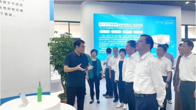 研究院展厅展示出公司固态储氢在交通领域应用的多辆不同车型样品。杨国豪主任边参观边不时询问,详细了解氢能电动车、氢能摩托车和氢能源工程车辆等科技示范性产品的关键性能指标、经济性及市场化应用等情况,并对研究院现阶段工作情况及取得的阶段性成果表示肯定和赞赏。