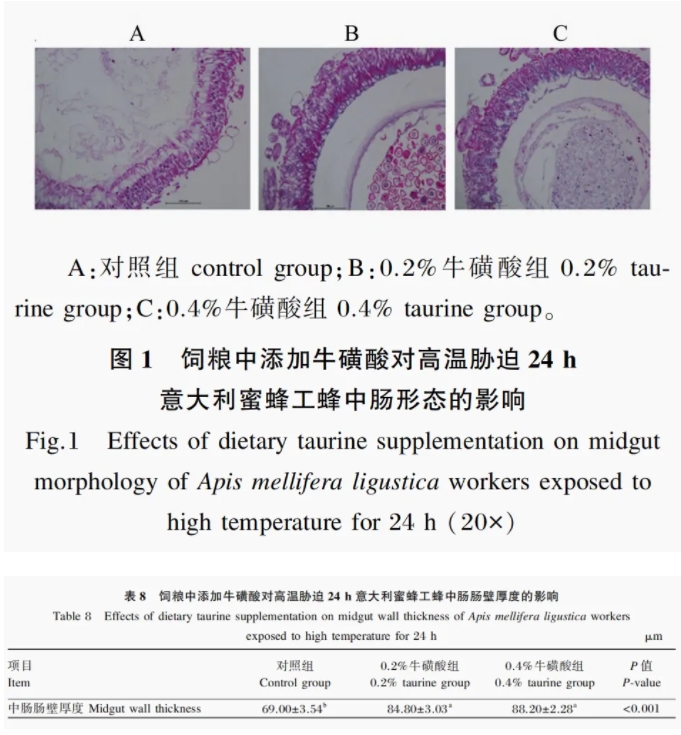 有研究表明,在小鼠肠道缺血再灌注的情况下,添加牛磺酸可以防止肠道黏膜上皮的损伤,修复肠道上皮黏膜损伤,抑制肠道上皮细胞凋亡;添加牛磺酸能够增加大鼠肠道黏膜重量,使肠道细胞代谢增强,从组织学上看,添加牛磺酸后增加了空肠和回肠绒毛高度,表明肠道的吸收表面积增大,而这与细胞质量增加密切相关;补充牛磺酸可缓解脂多糖引起的肉仔鸡十二指肠促凋亡蛋白表达增加和抗凋亡蛋白表达减少,提高十二指肠SOD活性,降低丙二醛(MDA)含量,增强十二指肠抗氧化状态,改善肠道炎症。本研究结果发现,在饲粮中添加0.2%或0.4%的牛磺酸显著增加了高温胁迫下7日龄意大利蜜蜂工蜂中肠肠壁厚度,说明添加牛磺酸可以促进蜜蜂肠道发育。