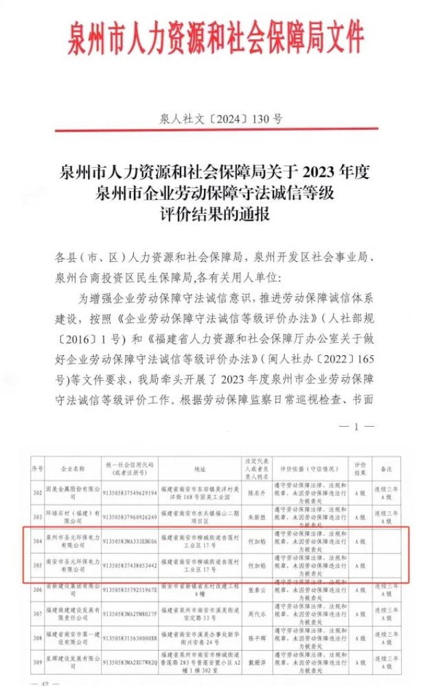 7月10日,泉州市人力资源和社会保障局印发关于2023 年度泉州市企业劳动保障守法诚信等级评价结果的通报,南安伟德国际1946bv官网和泉州伟德国际1946bv官网荣获“劳动保障守法诚信A级企业”称号。