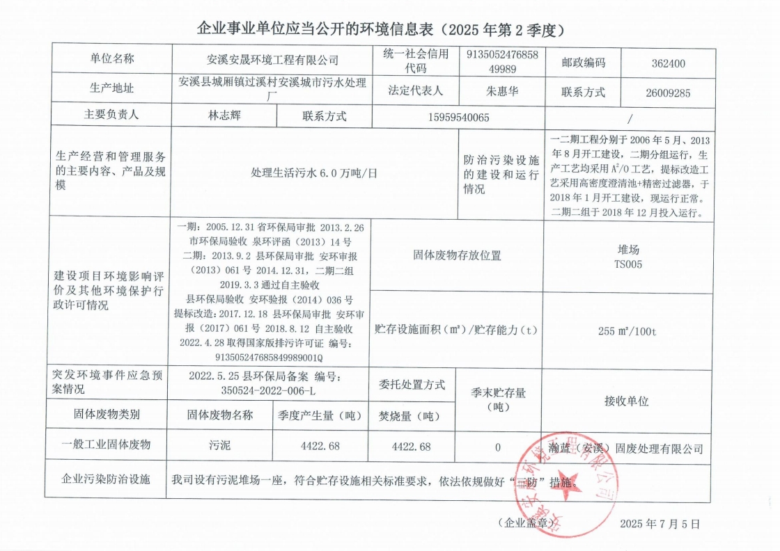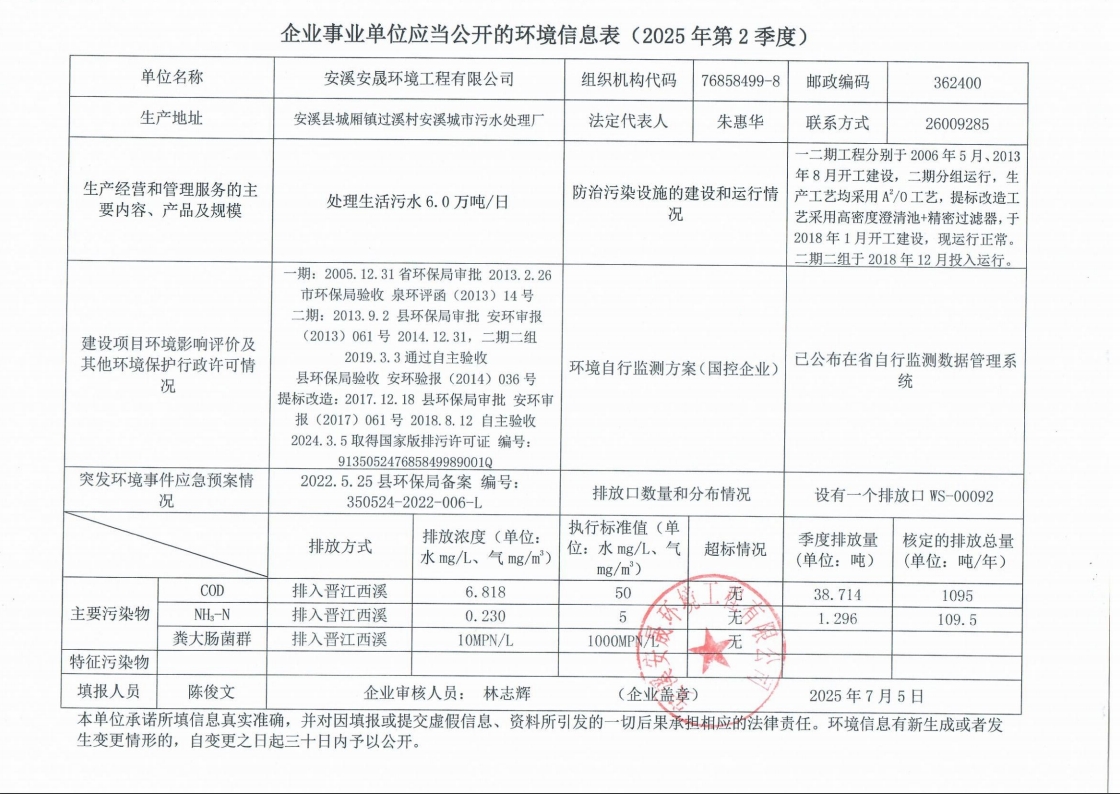 安溪城市污水处理厂2025年第2季度环境信息公开